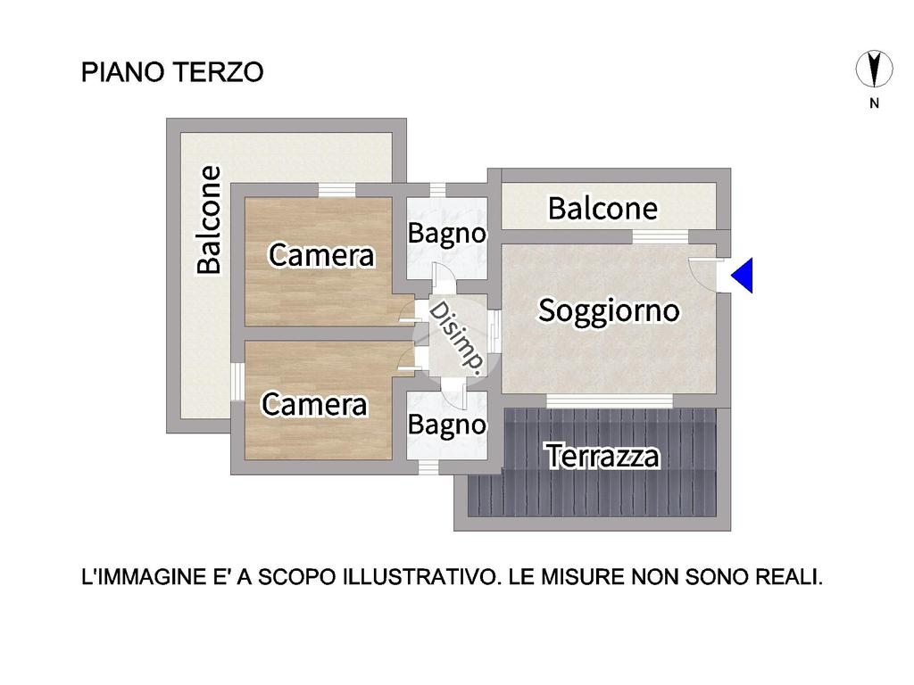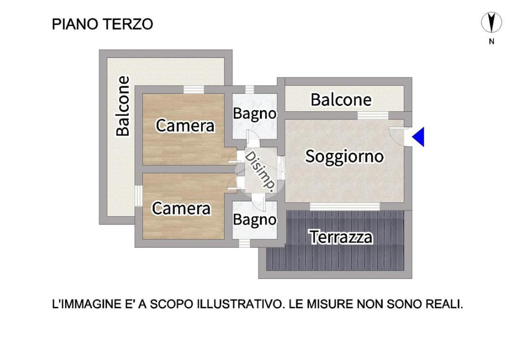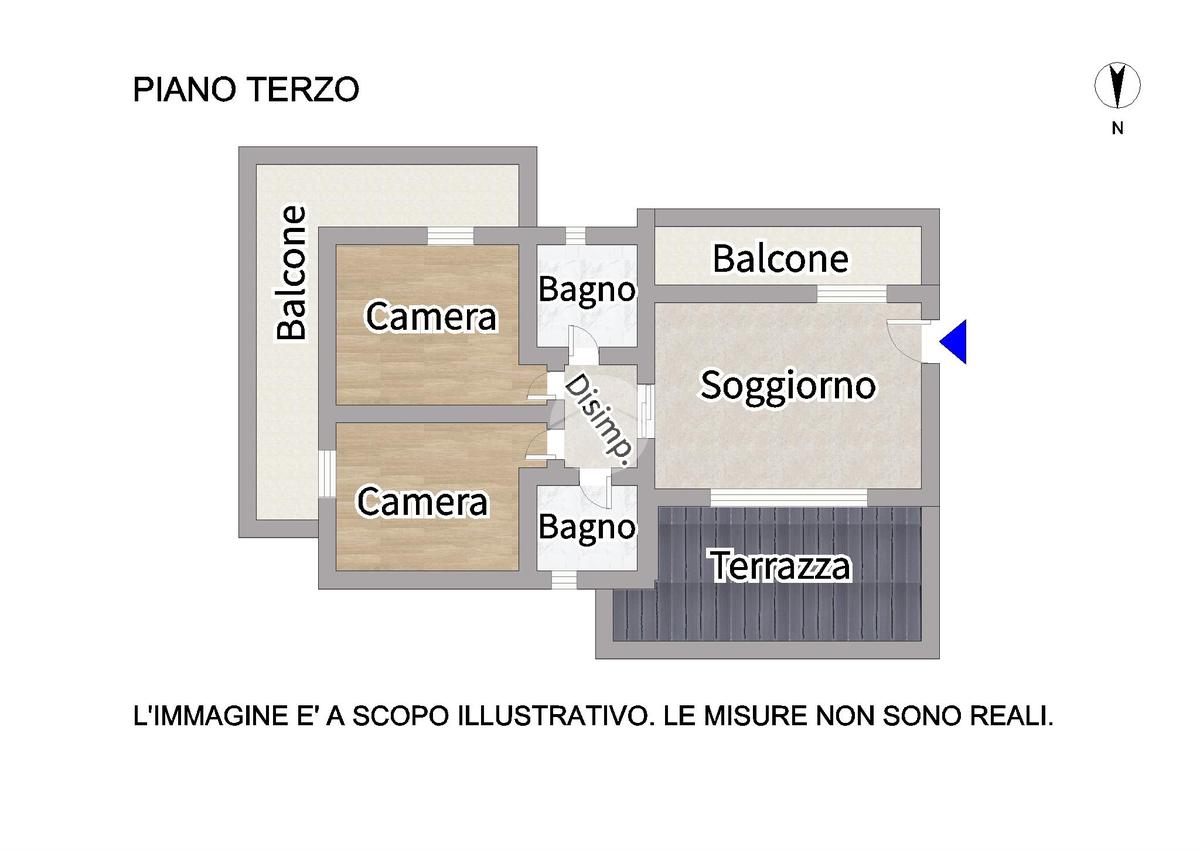 La soluzione è così composta: soggiorno con angolo cottura che affacciano su un terrazzo abitabile con vista mare laterale e un balcone, due camere con terrazzo angolare e due bagni con box doccia e finestra.